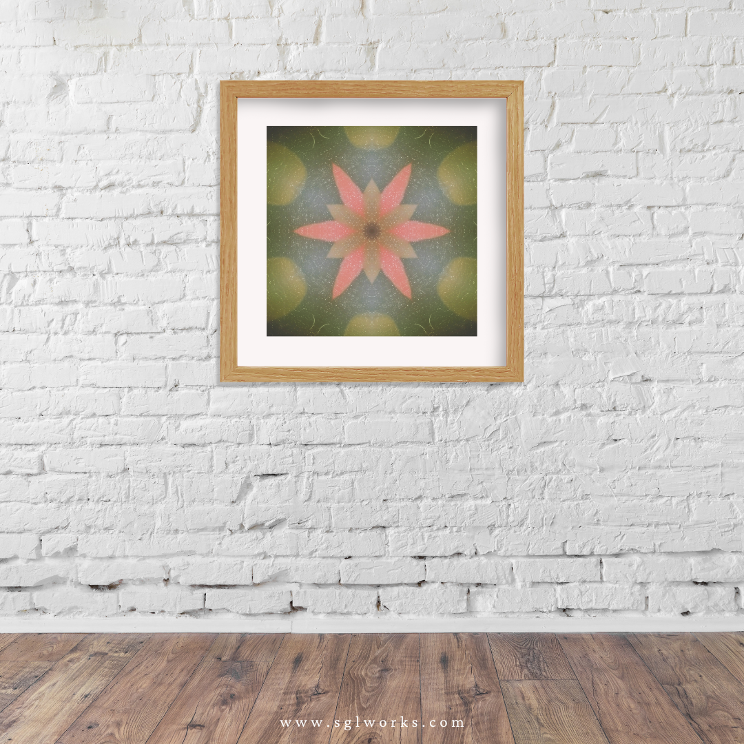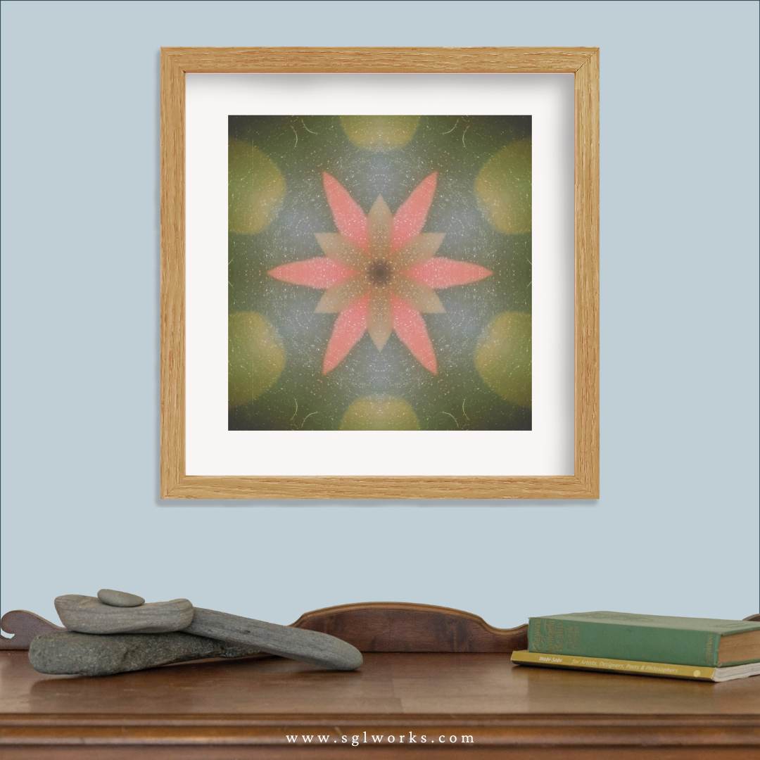 Fine Art Print: archival cotton paper; 2” white mat; 1.25” width Oak or Black Wood Frame; kraft dust cover; hanging hardware