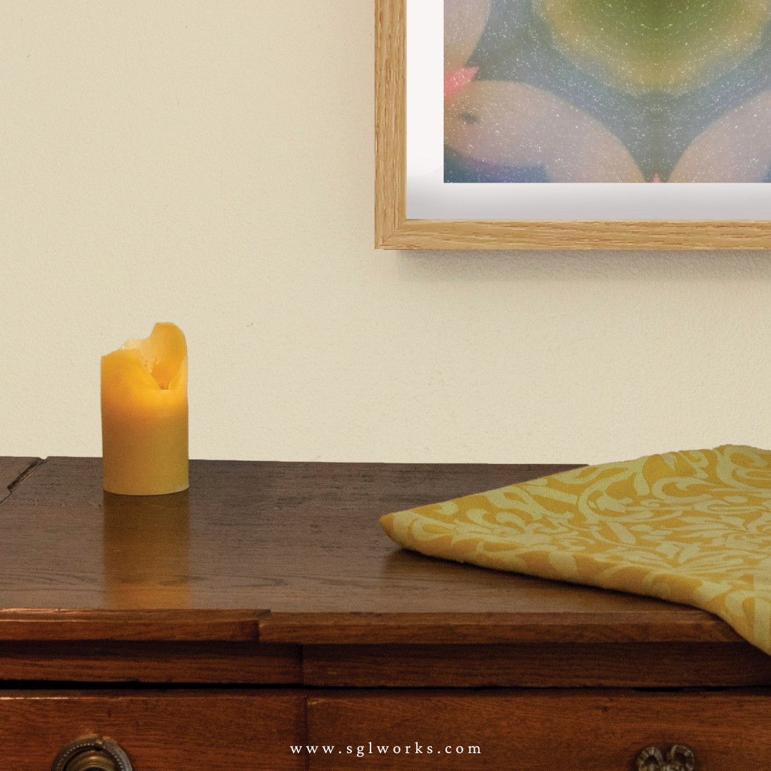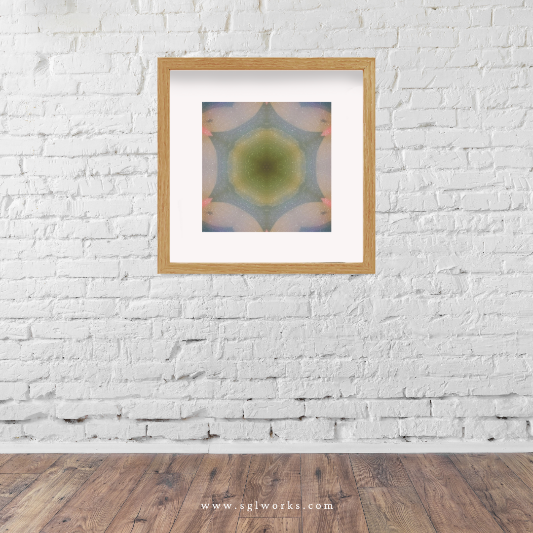Fine Art Print: archival cotton paper; 2” white mat; 1.25” width Oak or Black Wood Frame; kraft dust cover; hanging hardware
