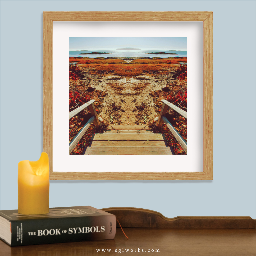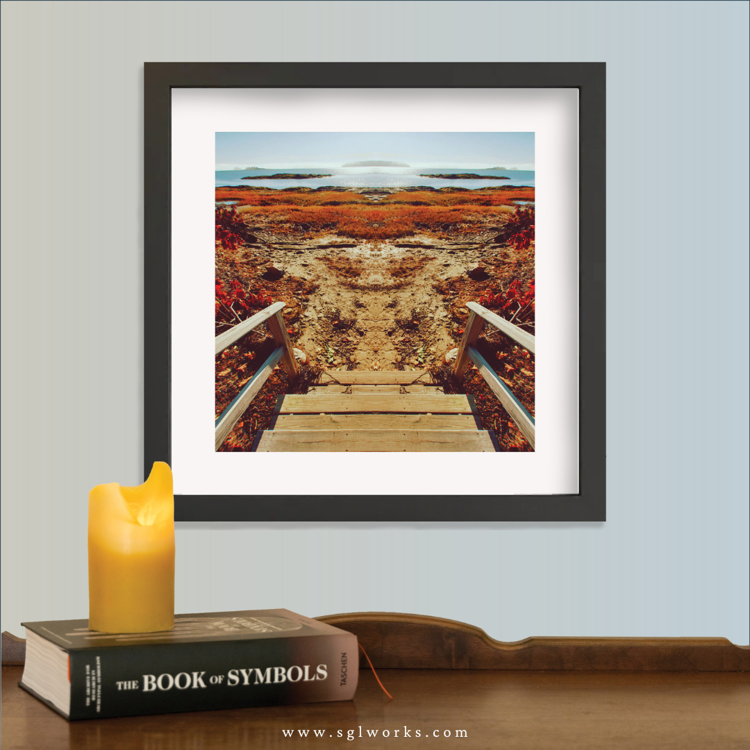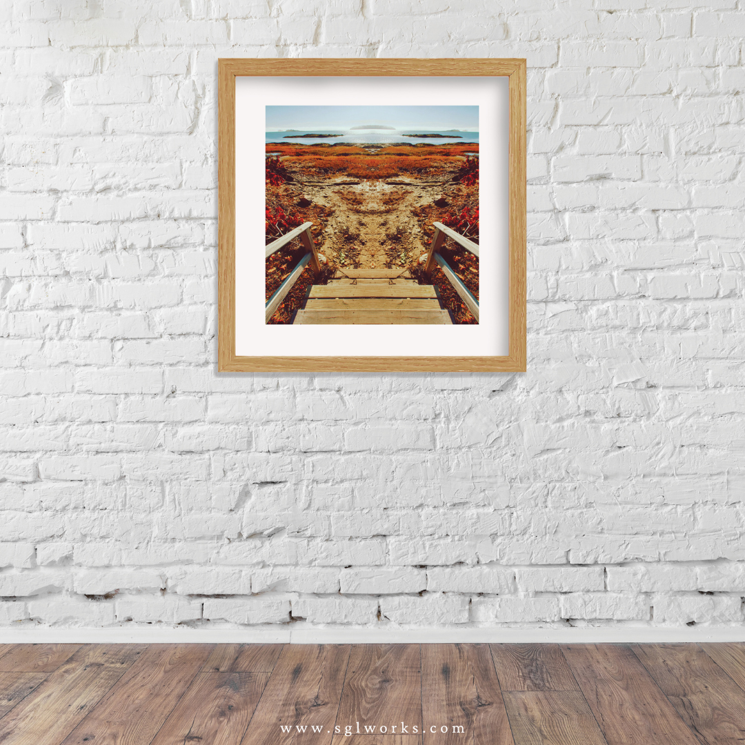 Fine Art Print: archival cotton paper; 2” white mat; 1.25” width Oak or Black Wood Frame; kraft dust cover; hanging hardware