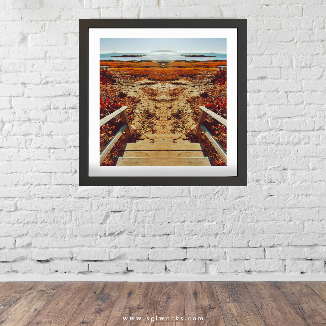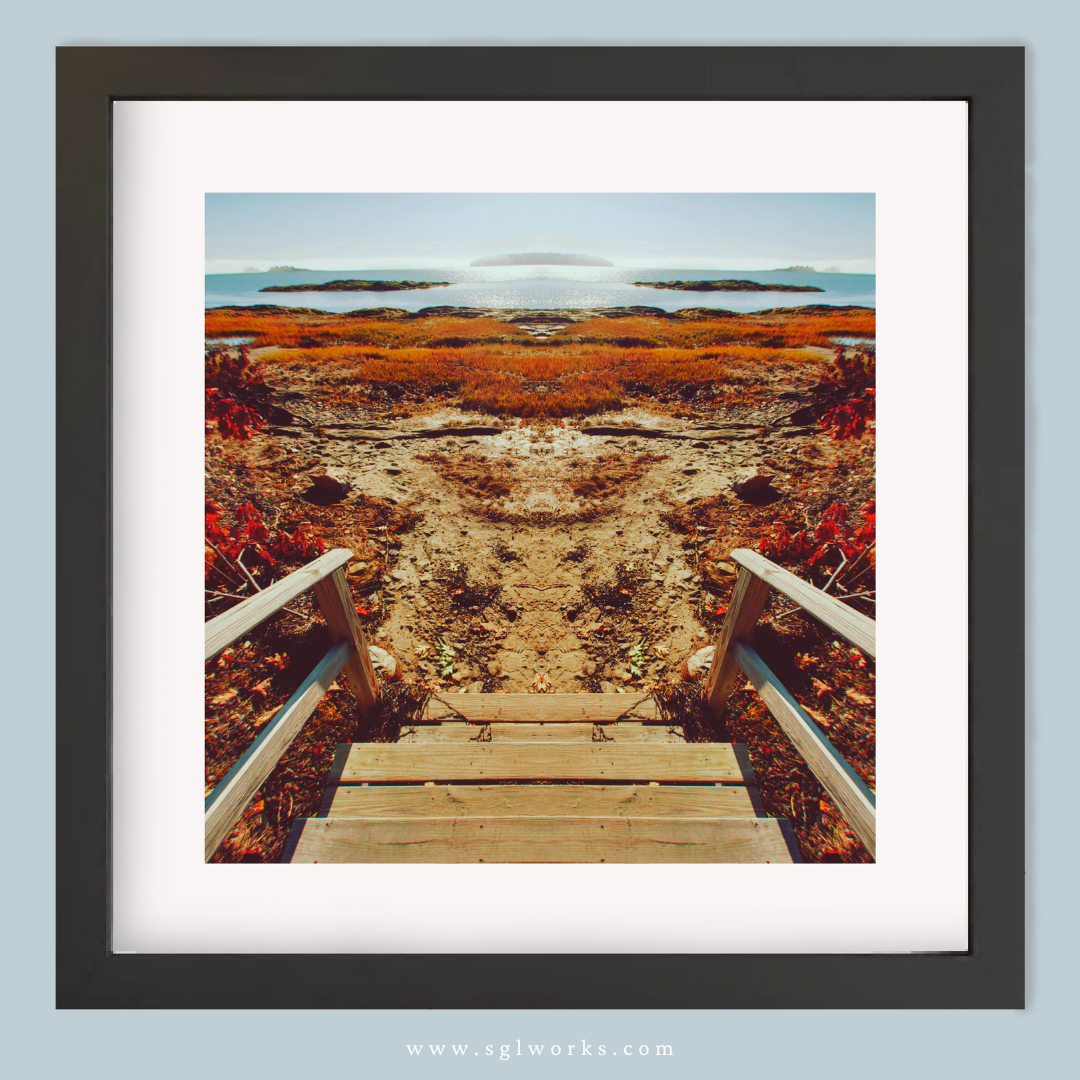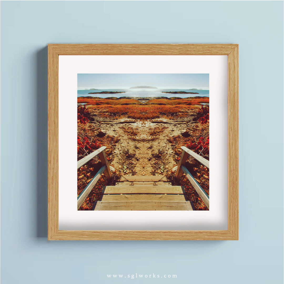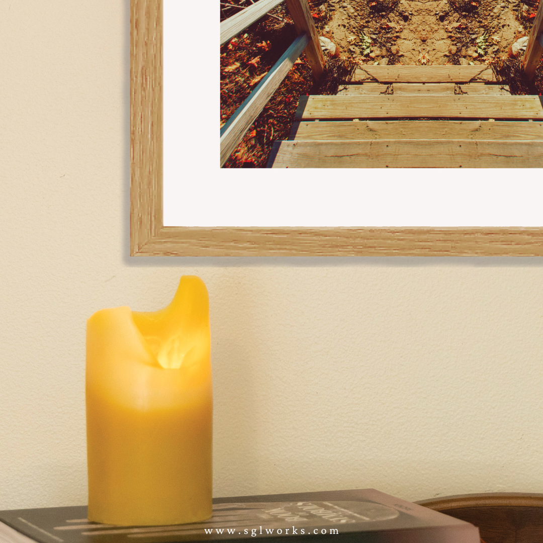 Fine Art Print: archival cotton paper; 2” white mat; 1.25” width Oak or Black Wood Frame; kraft dust cover; hanging hardware