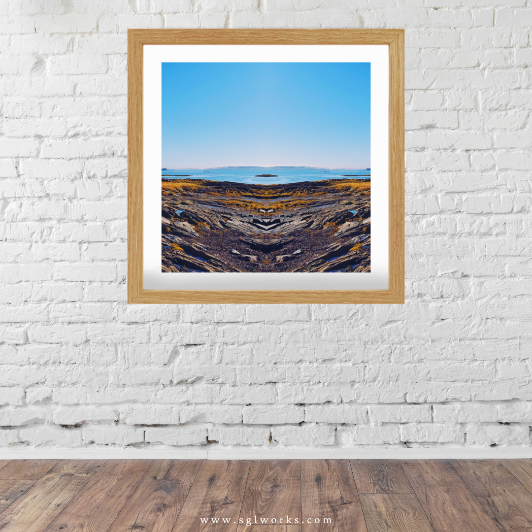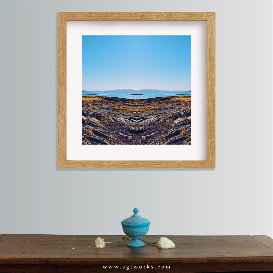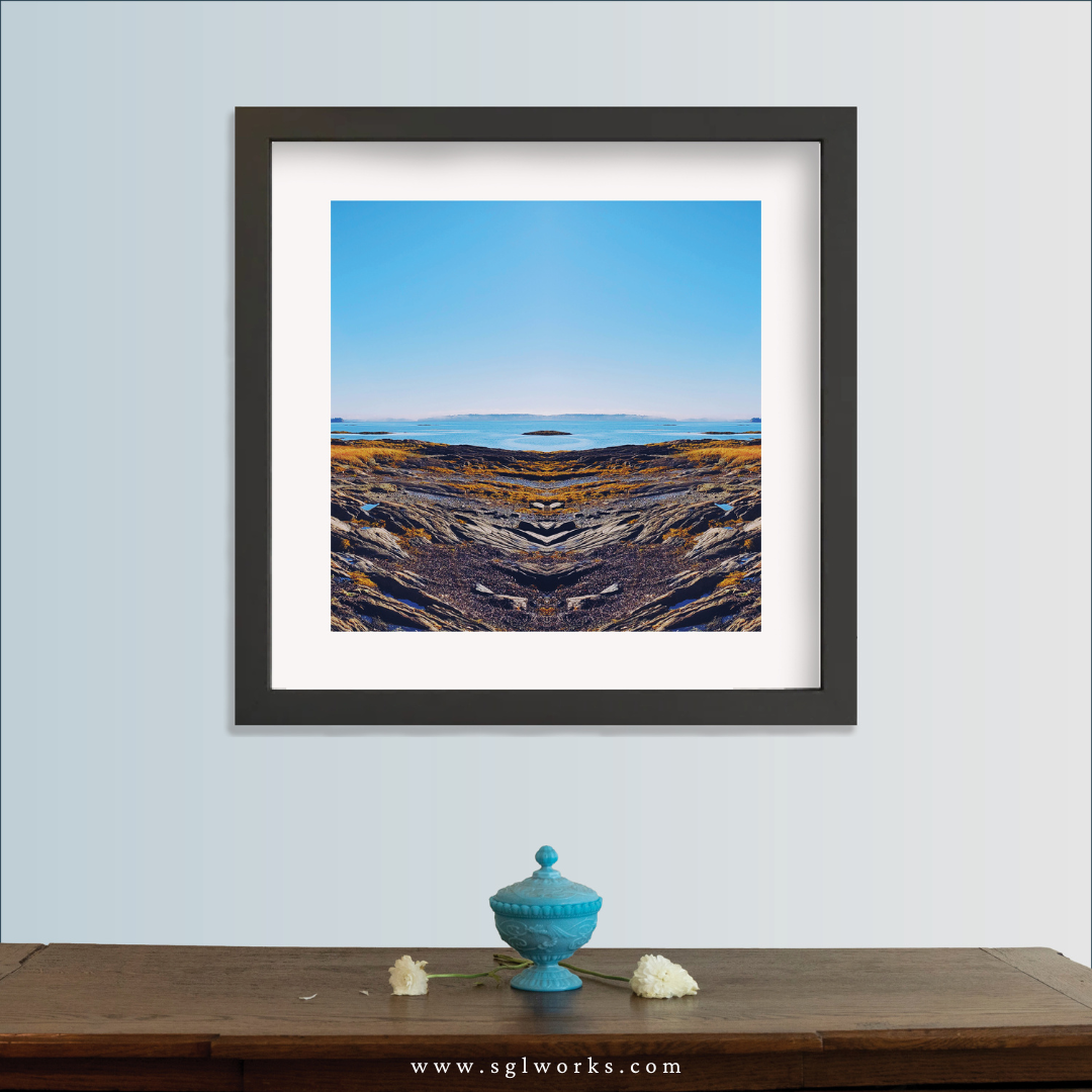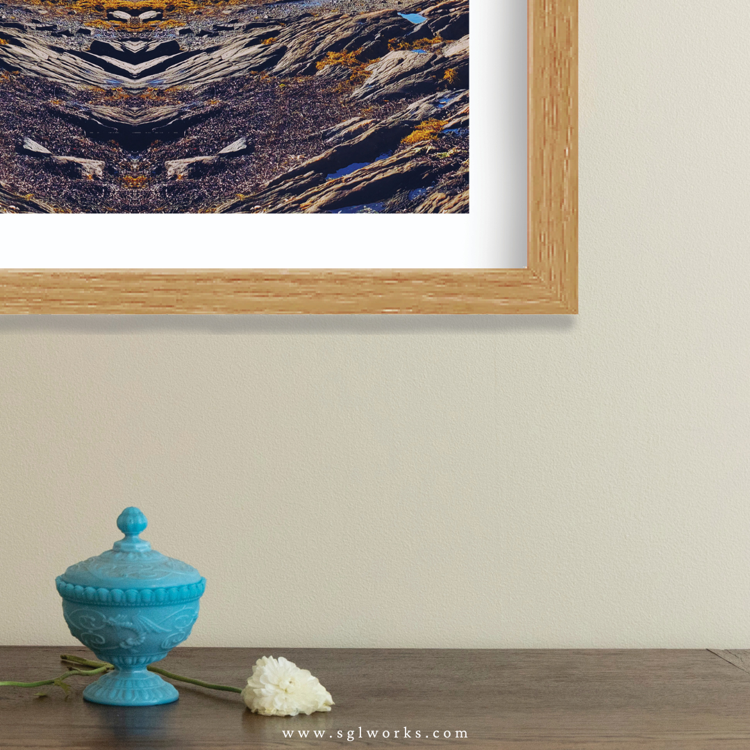 Fine Art Print: archival cotton paper; 2” white mat; 1.25” width Oak or Black Wood Frame; kraft dust cover; hanging hardware