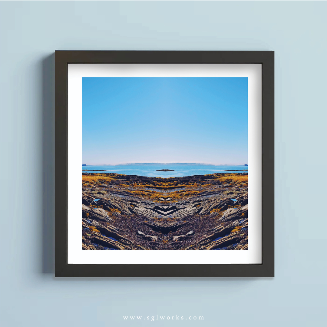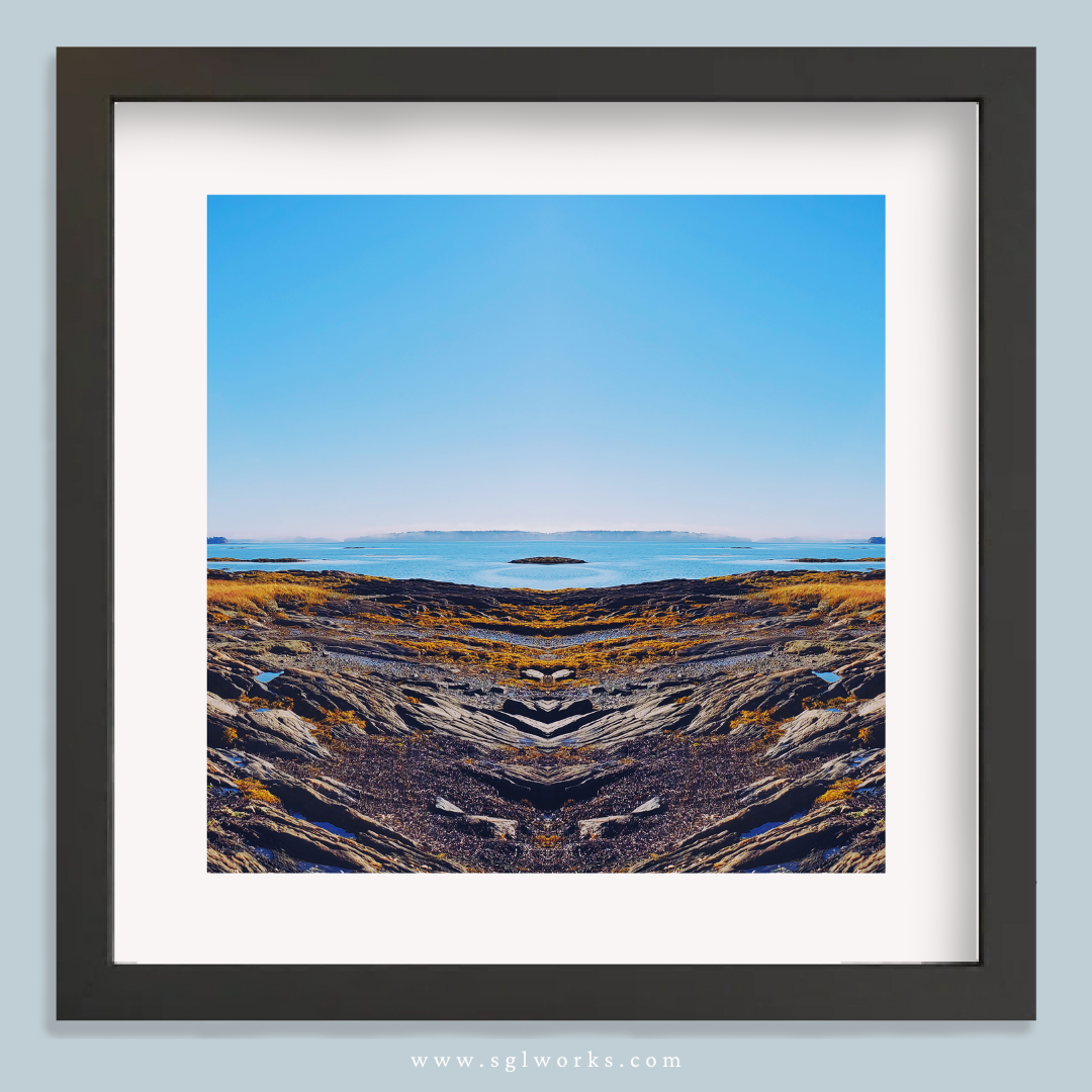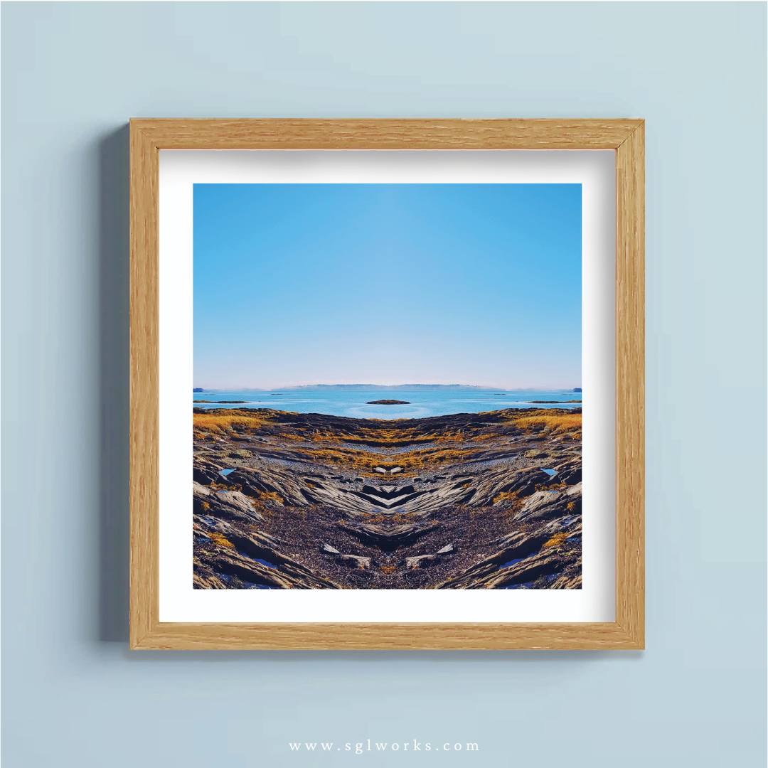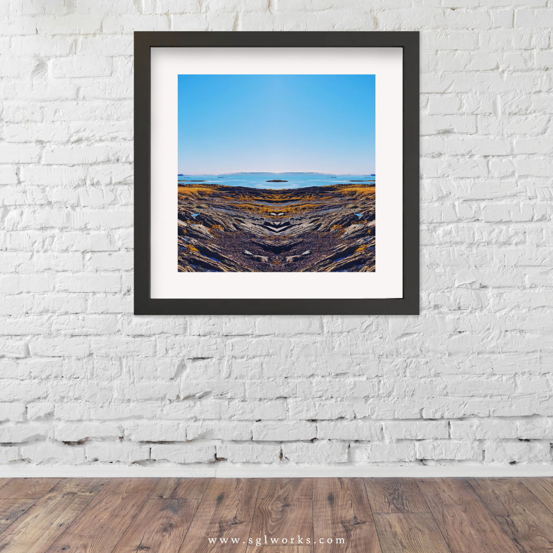 Fine Art Print: archival cotton paper; 2” white mat; 1.25” width Oak or Black Wood Frame; kraft dust cover; hanging hardware